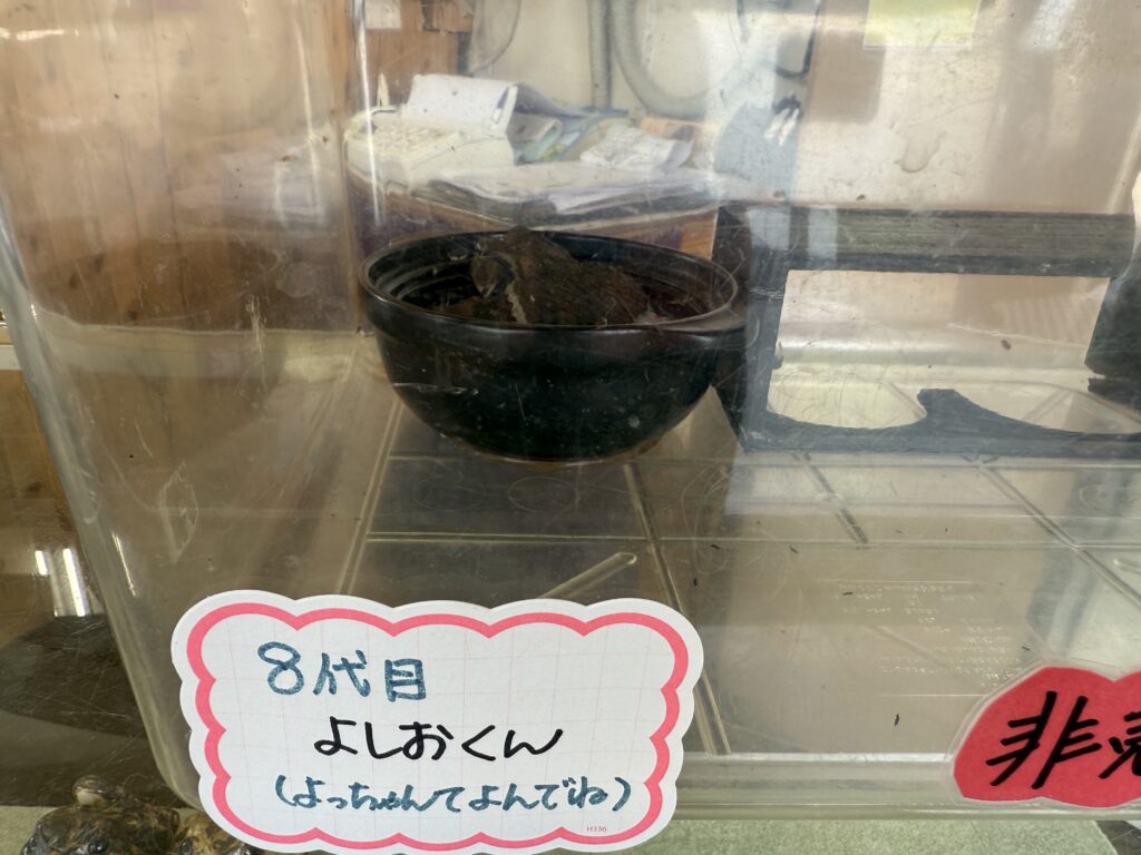 御幸ヶ原のお土産店にガマが…水の張ったドンんぶりに気持ちよさそうに浸っている。